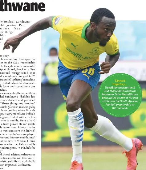 Peter shalulile currently plays for mamelodi sundowns as a right winger. Mamelodi sundowns coach rulani mokwena has responded to speculation that pitso mosimane is keen to lure peter shalulile to al ahly while addressing interest in his own services too. April 10, 2021 mamelodi sundowns assistant coach, rulani mokowena, denied all rumours suggesting that there have been talks between al ahly and team striker peter shalulile. In the 19/20 season the deadly striker claimed the psl top goal scorer award. €1.00m * oct 23, 1993 in eengolo , namibia